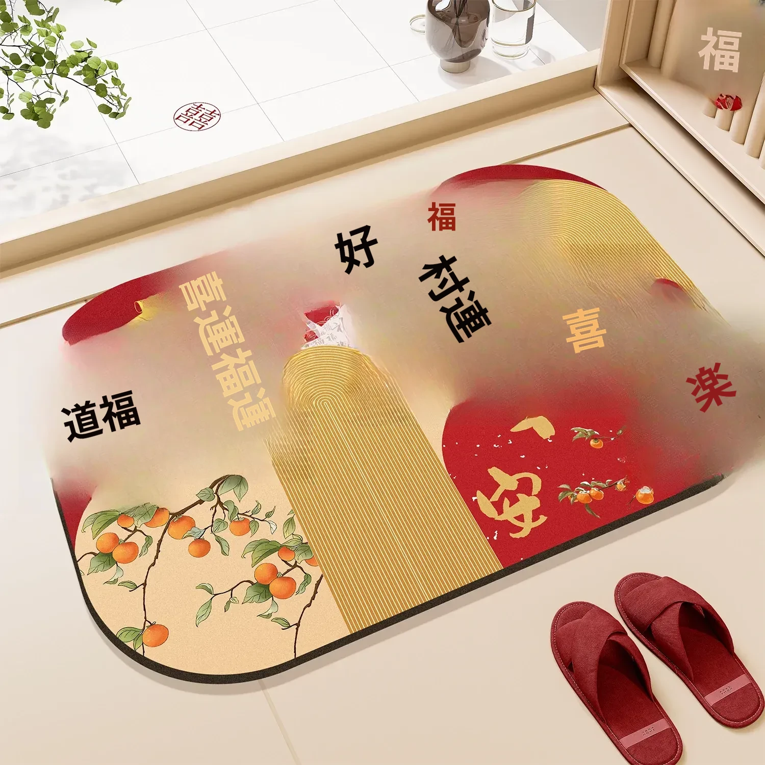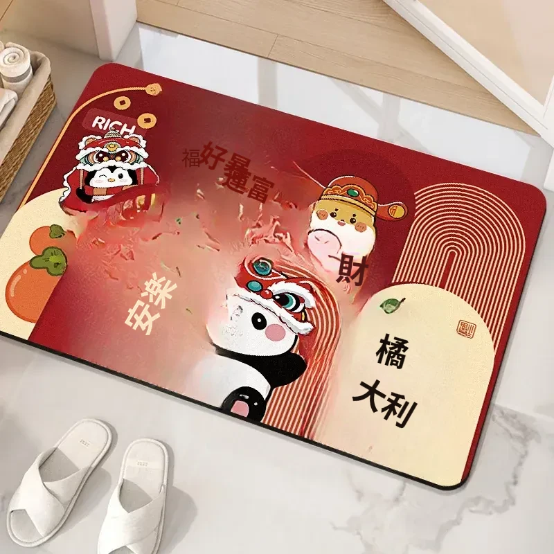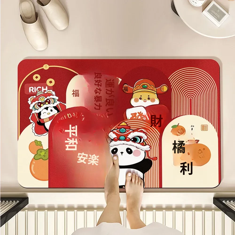 赤いバスルームマット - 吸水性抜群のシリカゲル製、滑り止め付きで安全安心。トイレやバスルームのエントランスに最適。新年のお祝いにぴったりな華やかなデザインで、快適な空間を演出します!