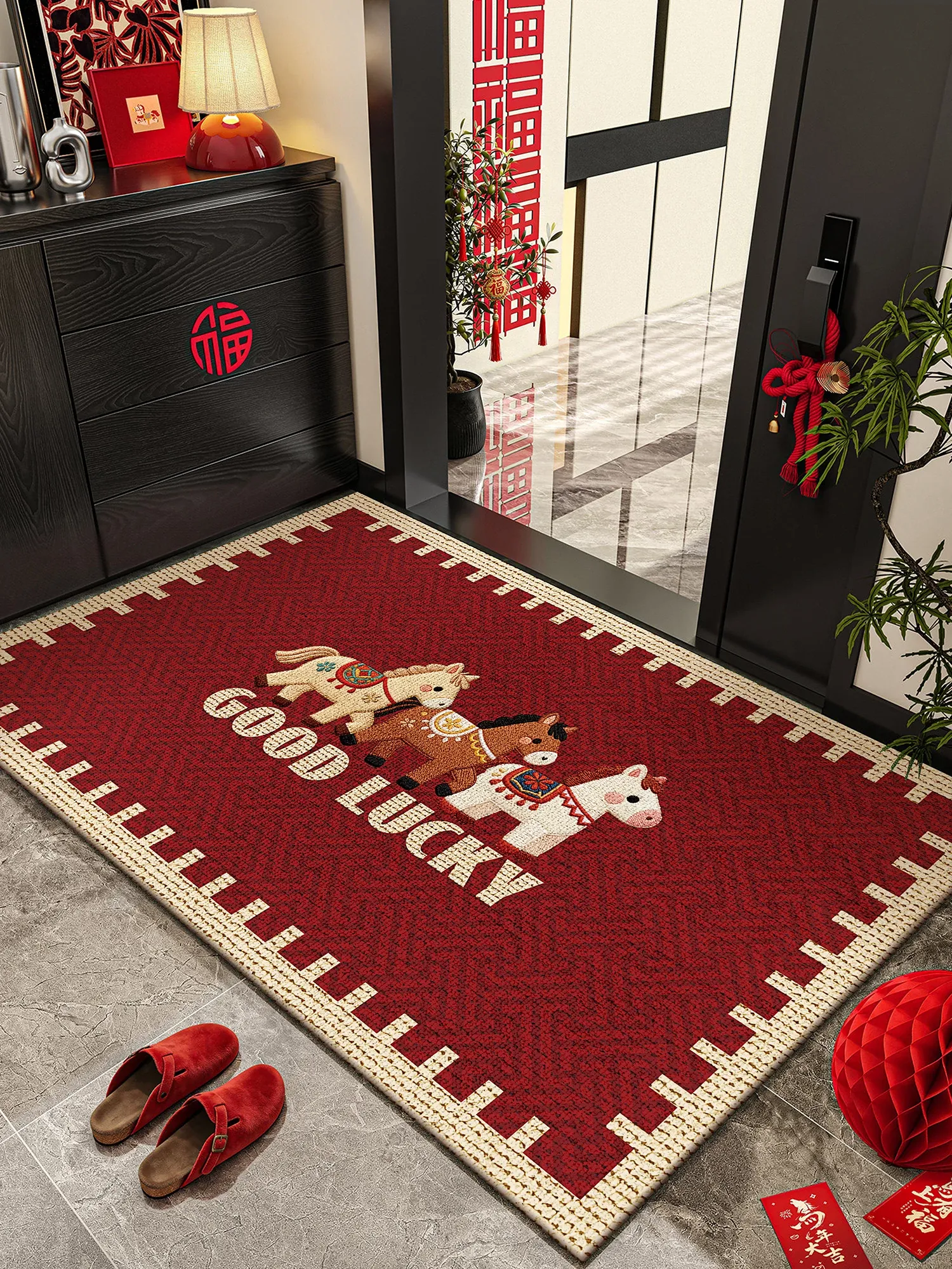 2026年新作!可爱な赤い馬年入門マット - 玄関や靴脱ぎエリアにぴったりのシルクループカーペット!おしゃれで温かみのあるデザインで、お家に幸運を呼び込みましょう!