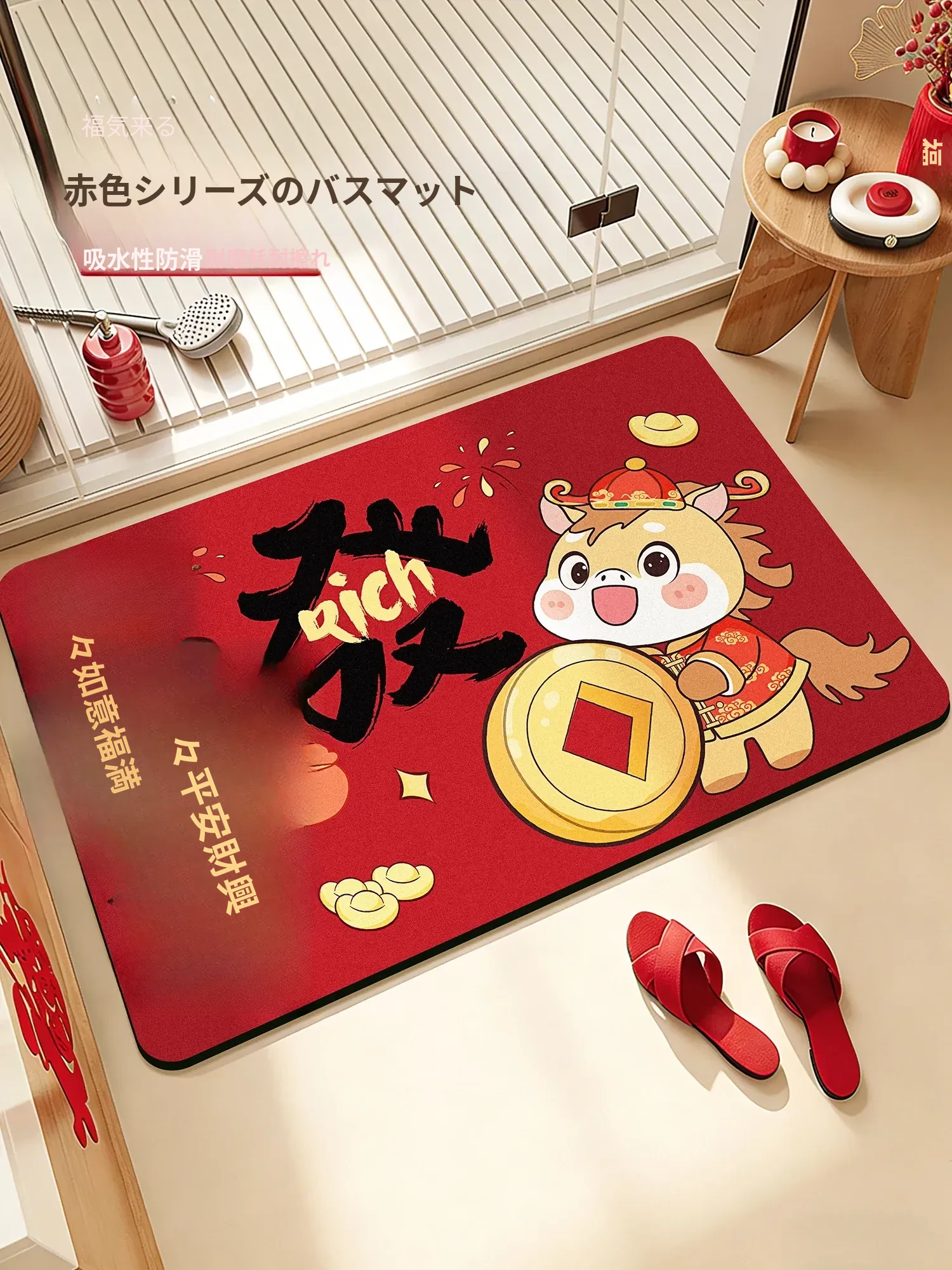 新年の祝いにぴったり!速乾・吸水性抜群の赤い防滑バスマット。馬年にちなんだデザインで、お手洗いの入り口を華やかに彩ります!快適な足元を実現し、家族みんなが喜ぶ一品です。