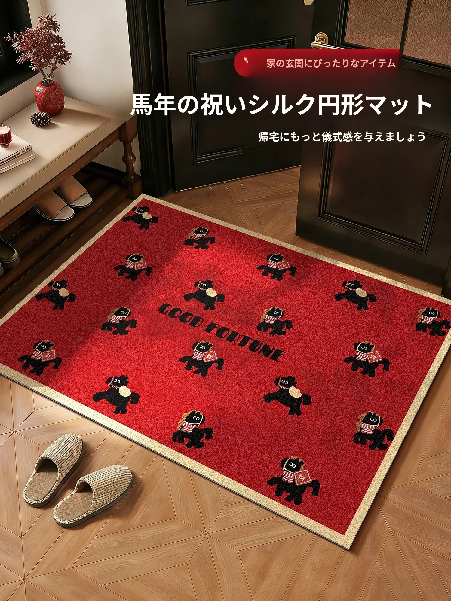 2026年新作!可爱な赤い馬年入門マット - 玄関や靴脱ぎエリアにぴったりのシルクループカーペット!おしゃれで温かみのあるデザインで、お家に幸運を呼び込みましょう!