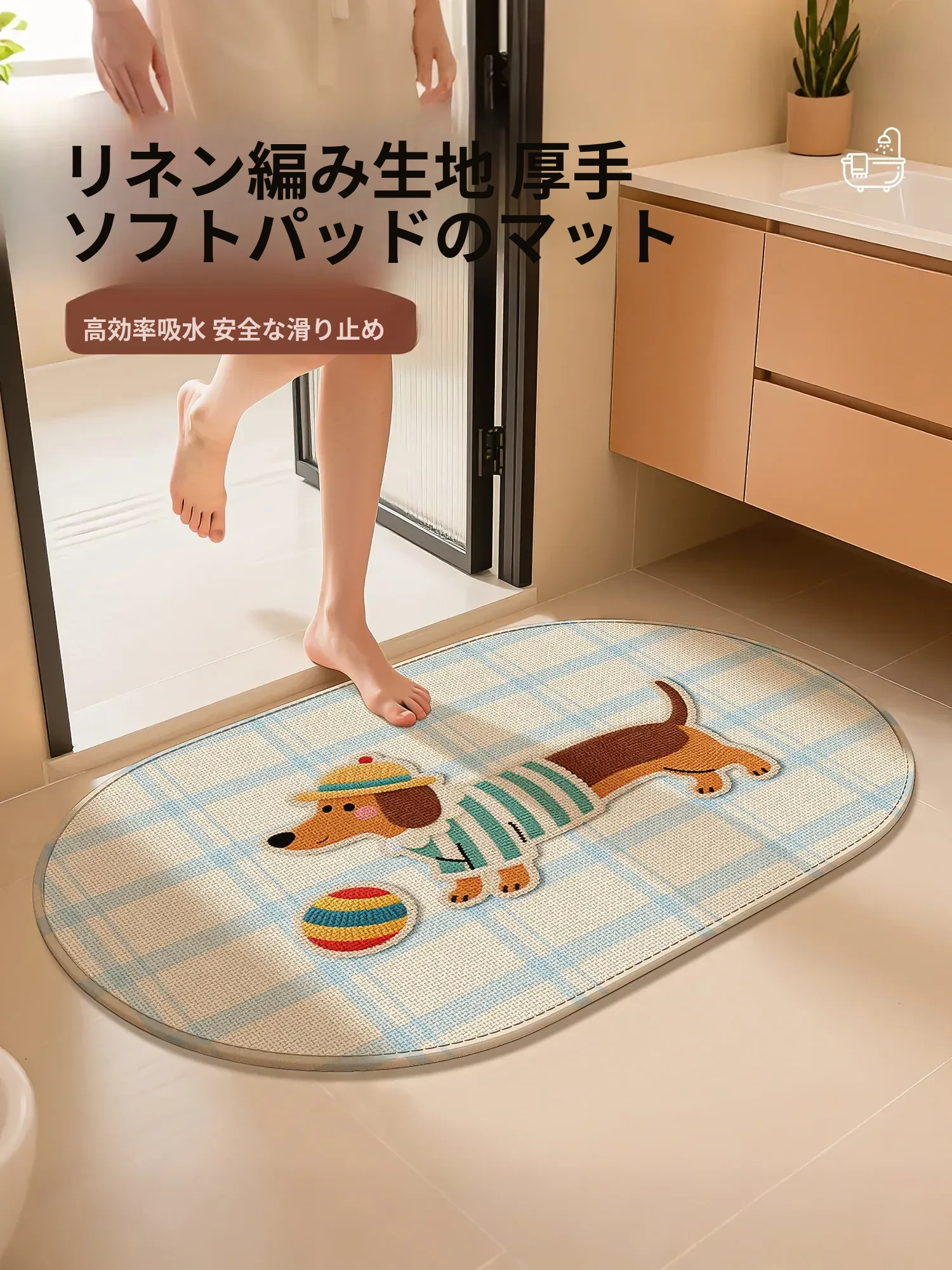 カラフルなカートゥーンデザインの吸水バスマット - 厚手で滑り止め機能付き、トイレの入り口にぴったりなリネン風の織り模様!快適さと安全性を両立したおしゃれなバスマットで、毎日のバスタイムをもっと楽しく!