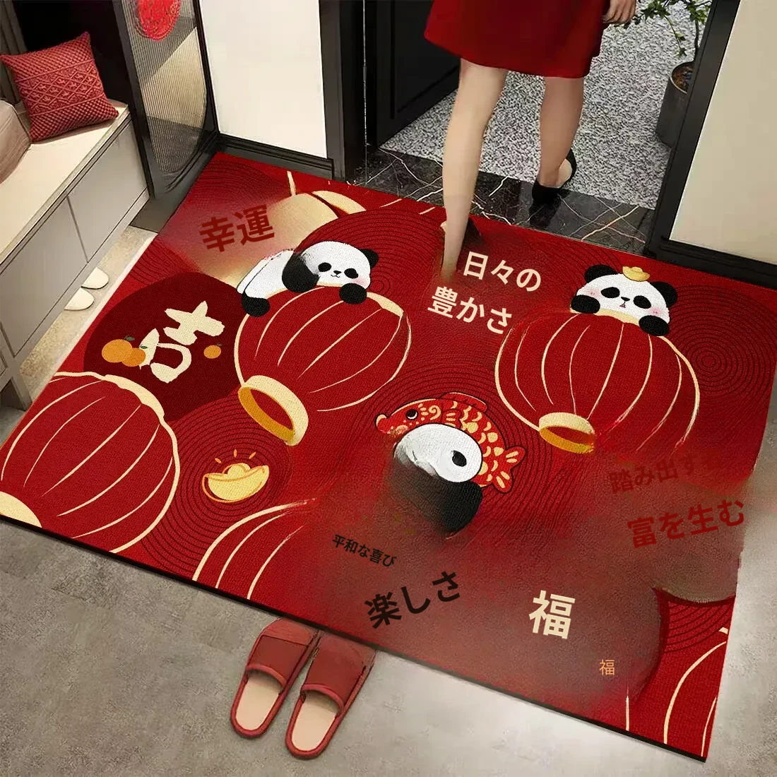 新年の幸運を呼ぶ!可愛いパンダの入門マット 滑り止め付き 家庭用玄関マット お祝いムード満点の赤い足マット 汚れに強いデザインで、毎日の使い勝手も抜群!