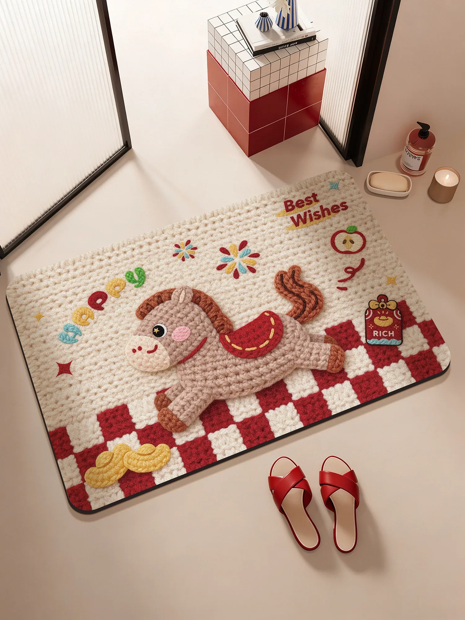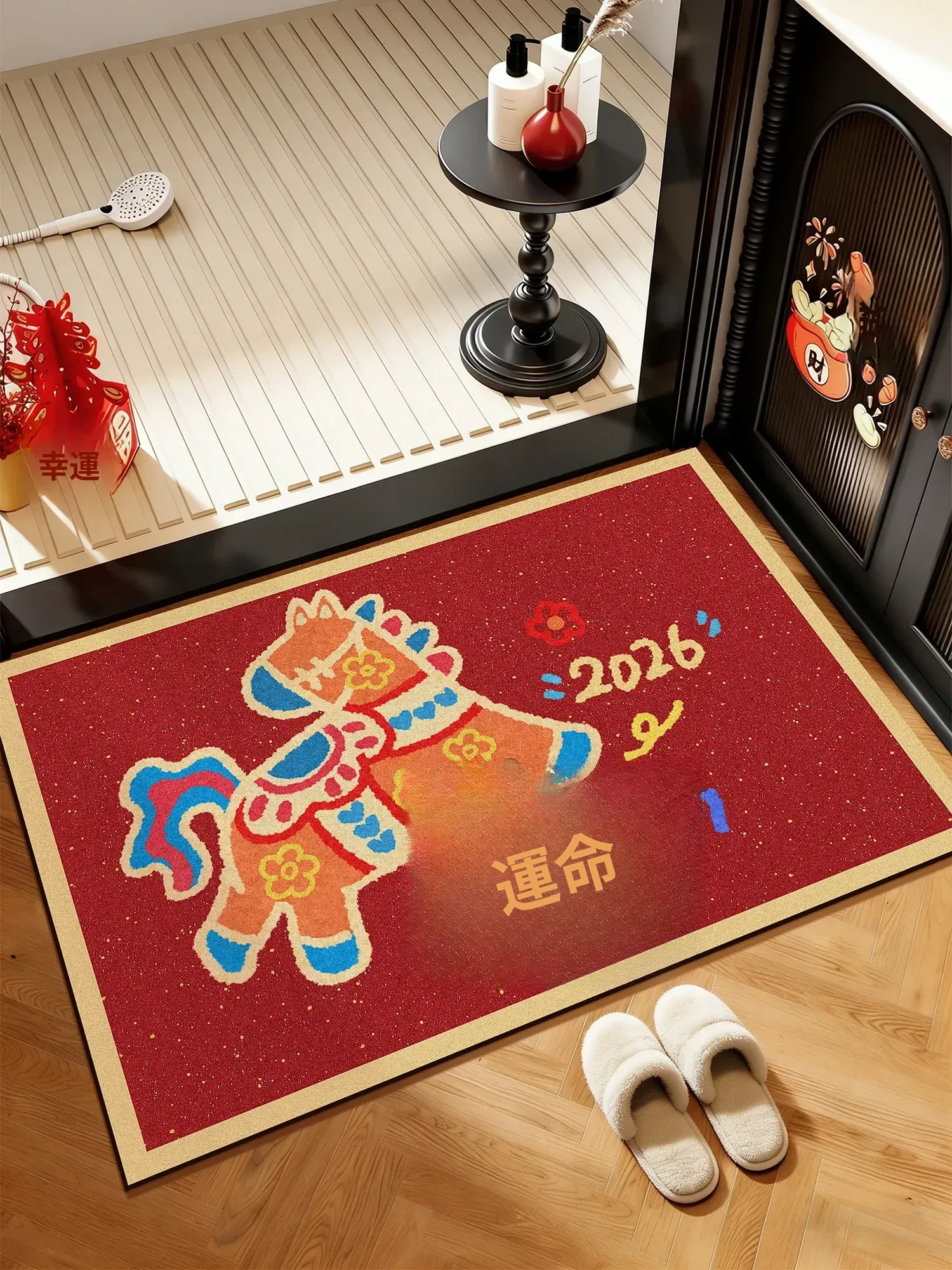 新年の祝いにぴったり!速乾・吸水性抜群の赤い防滑バスマット。馬年にちなんだデザインで、お手洗いの入り口を華やかに彩ります!快適な足元を実現し、家族みんなが喜ぶ一品です。