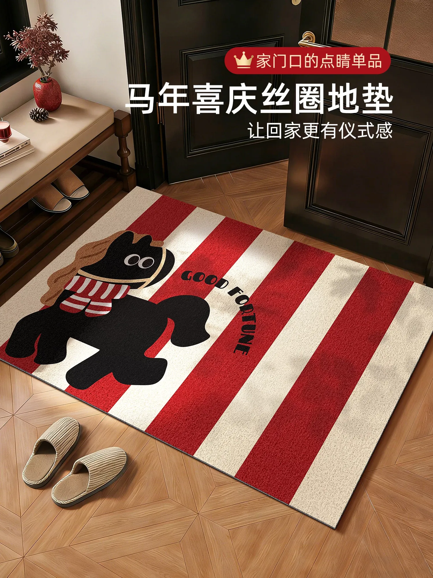 馬年の雰囲気を盛り上げる!鮮やかな赤の玄関マットでお出迎え。厚手のシルクフックデザインが土間を優しく守り、家の中に幸運を呼び込む一品。おしゃれで機能的な入り口の必需品です!