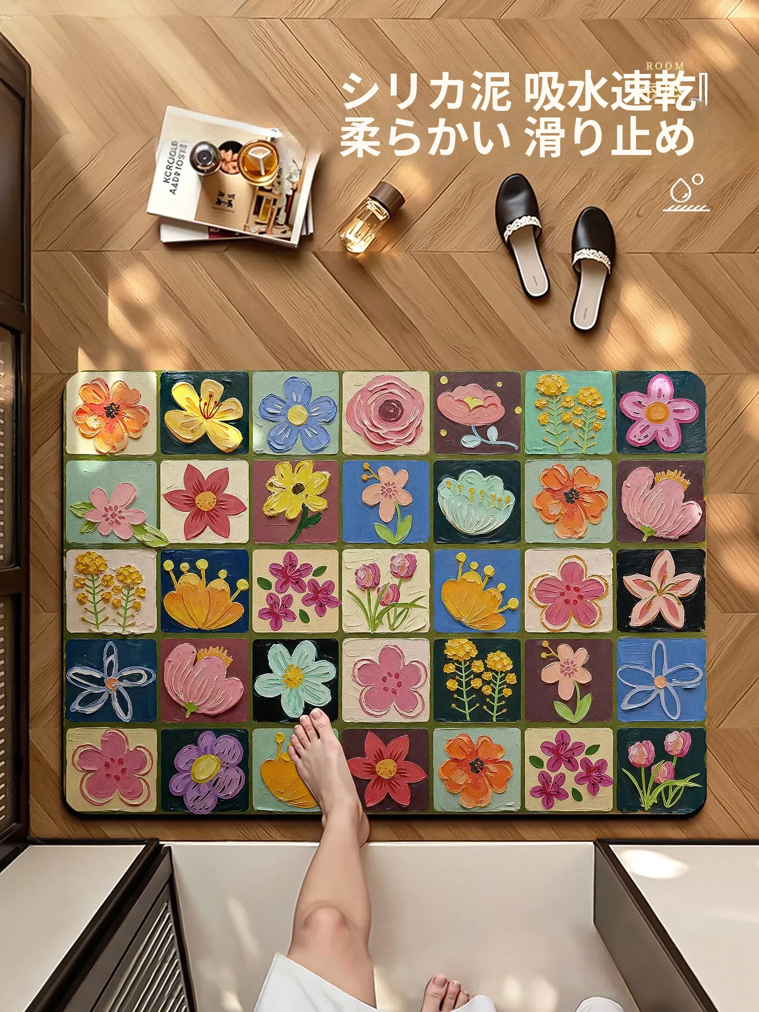 吸水性抜群!滑り止め付きのバスルームマット - トイレや洗面所にぴったりなデザイン。健康的な珪藻土素材で、快適なバスタイムをサポートします。おしゃれな玄関マットとしてもおすすめ!