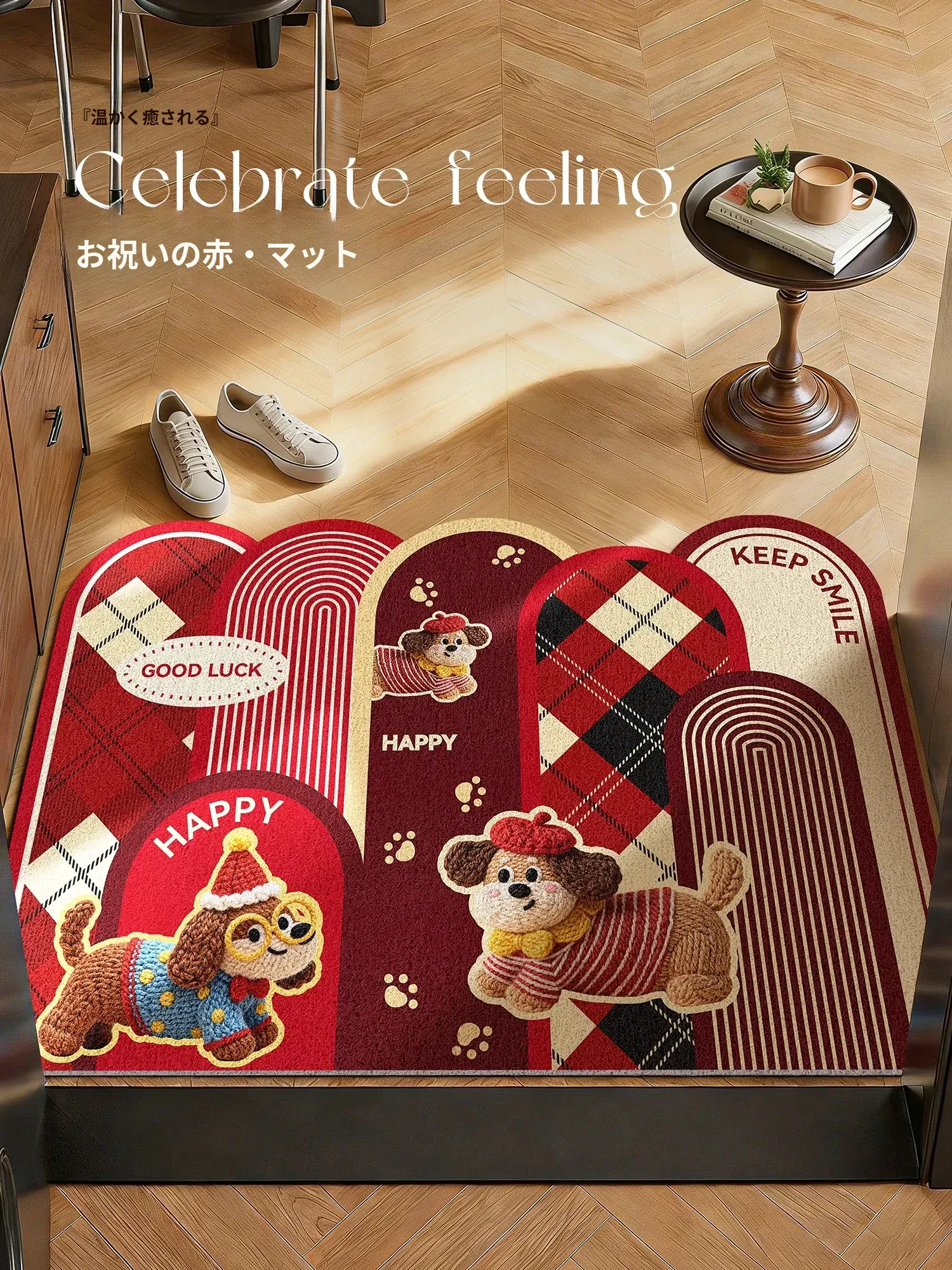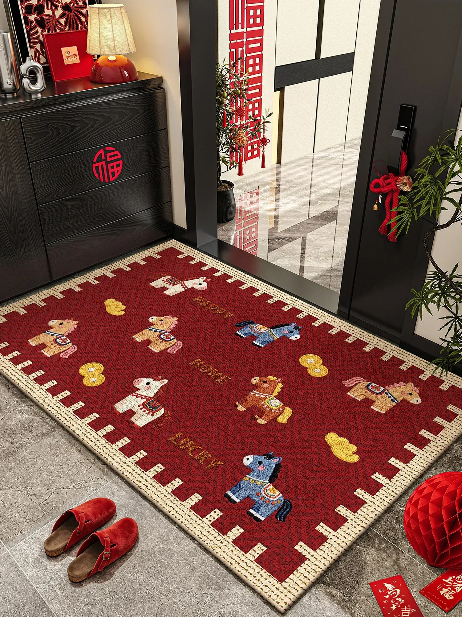 2026年馬年新作!おしゃれなレッド玄関マット - 滑り止め付きで安心、華やかなデザインでお迎えする特別な一枚。高級感溢れる玄関を演出しましょう!