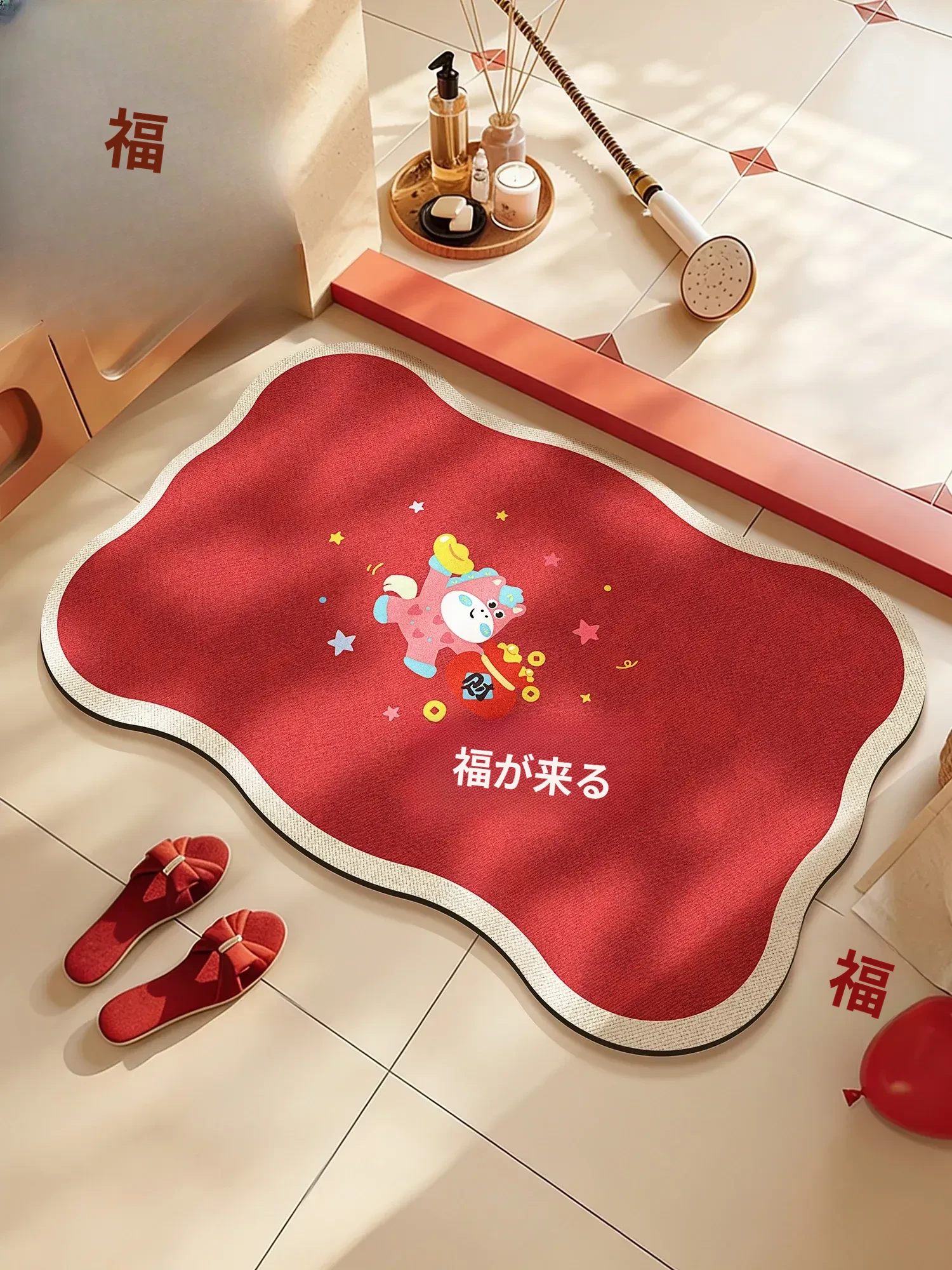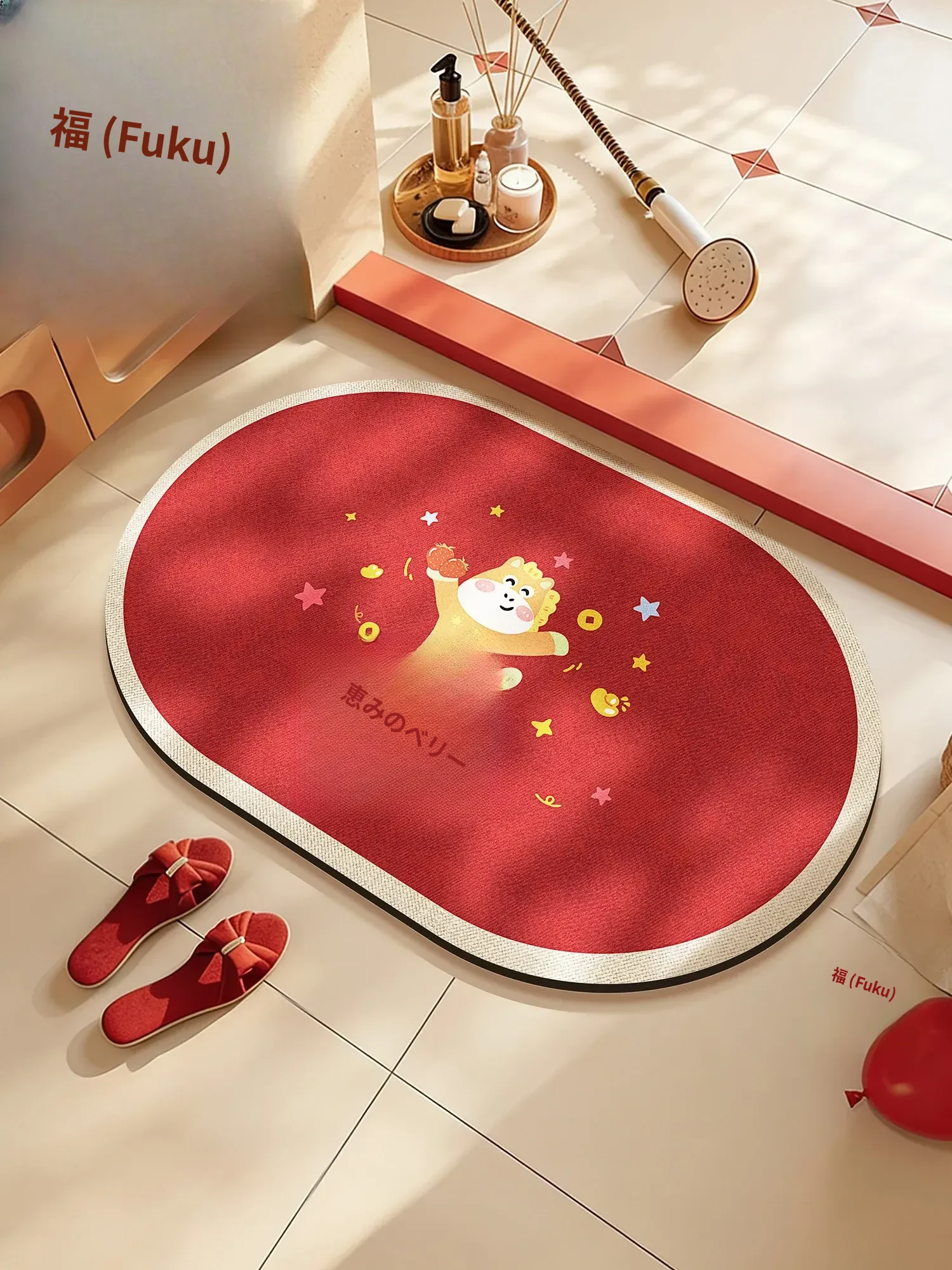 新年を祝う!赤いバスルームマット、吸水性抜群の珪藻土マット。滑り止め付き、トイレや玄関に最適な家庭用フットマットで、衛生的で快適な空間を演出します!