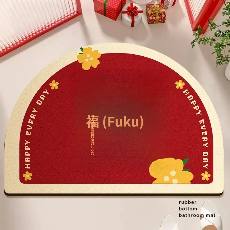 新年を祝う!赤い半円形の滑り止めマット - シリカゲル製、家庭用バスルームに最適な吸水速乾フロアマット。安全で快適な足元を提供します!