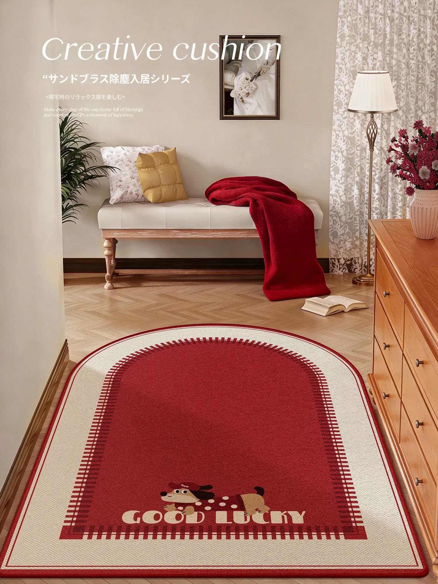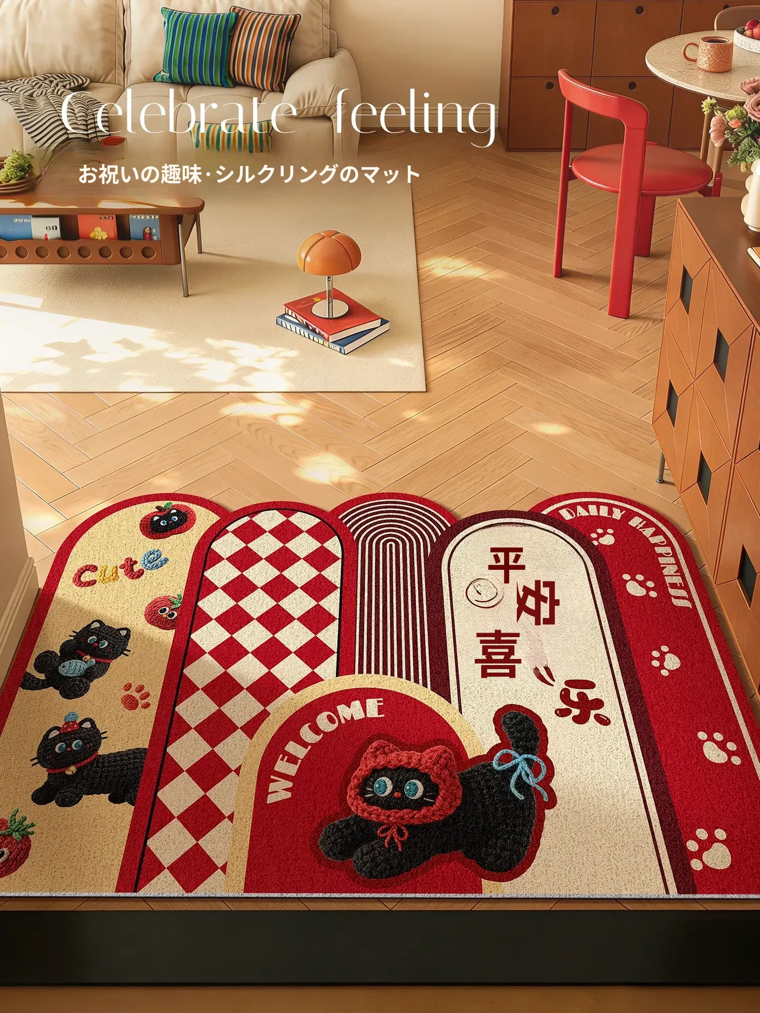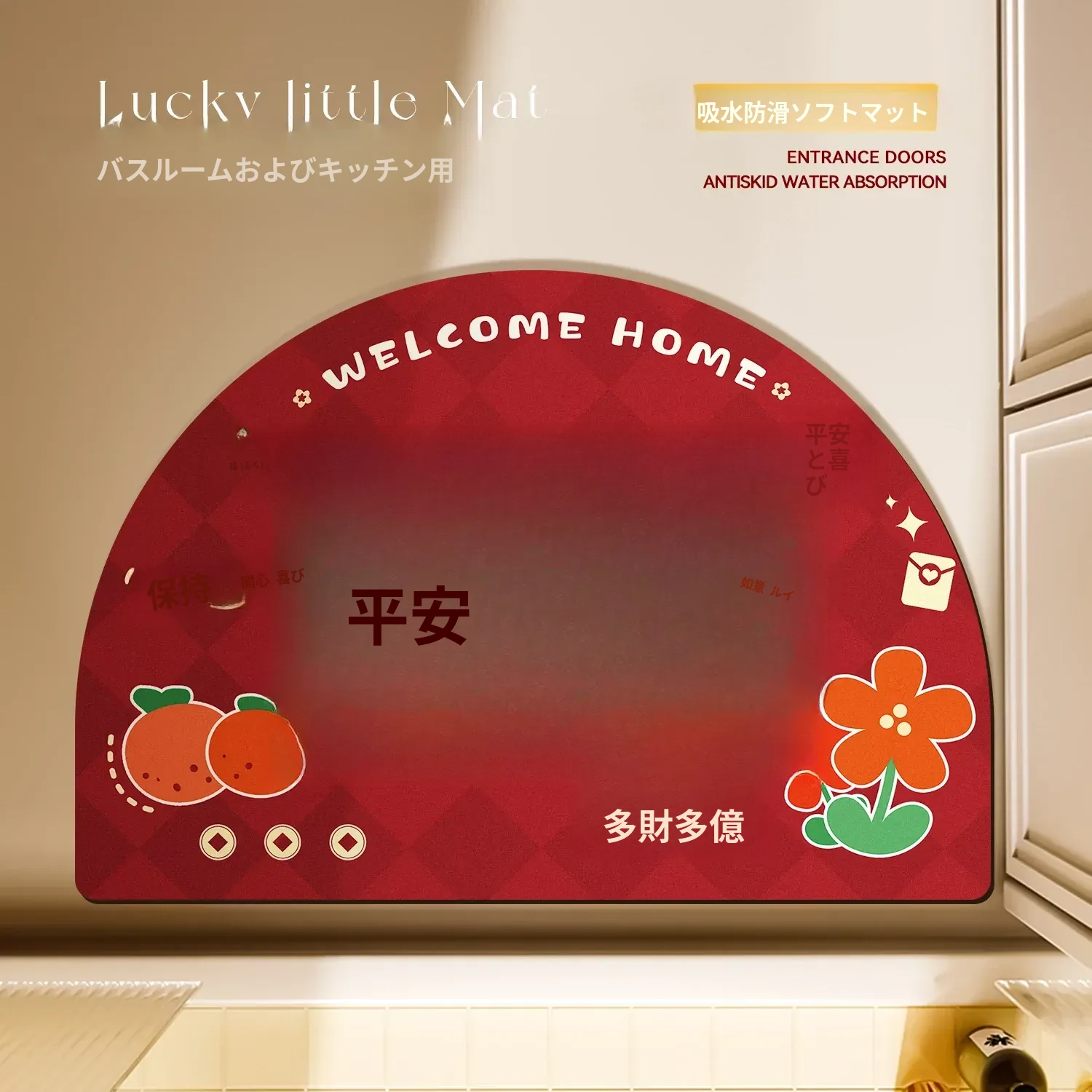 新年を祝う赤い厚手玄関マット!おしゃれで耐久性抜群、滑り止め機能付き。家族を迎える半円形のデザインで、玄関を明るく華やかに演出します。お掃除も簡単で、毎日使いたくなる一品です!