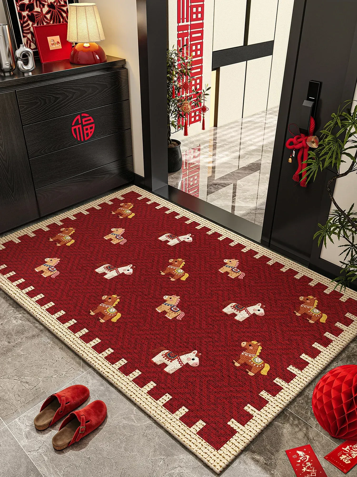 2026年馬年新作!おしゃれなレッド玄関マット - 滑り止め付きで安心、華やかなデザインでお迎えする特別な一枚。高級感溢れる玄関を演出しましょう!